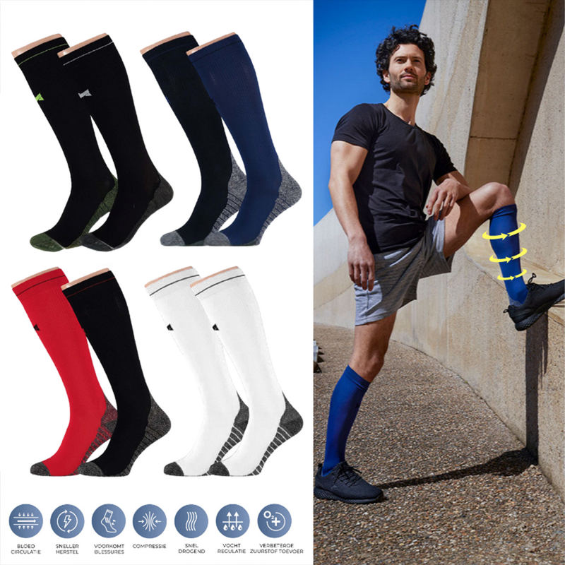 Voorkom vermoeide benen, opgezwollen voeten of blessures tijdens en na een werkdag, workout of lange reis. Met deze hoge compressiekousen blijf je vitaal en vrij van klachten!